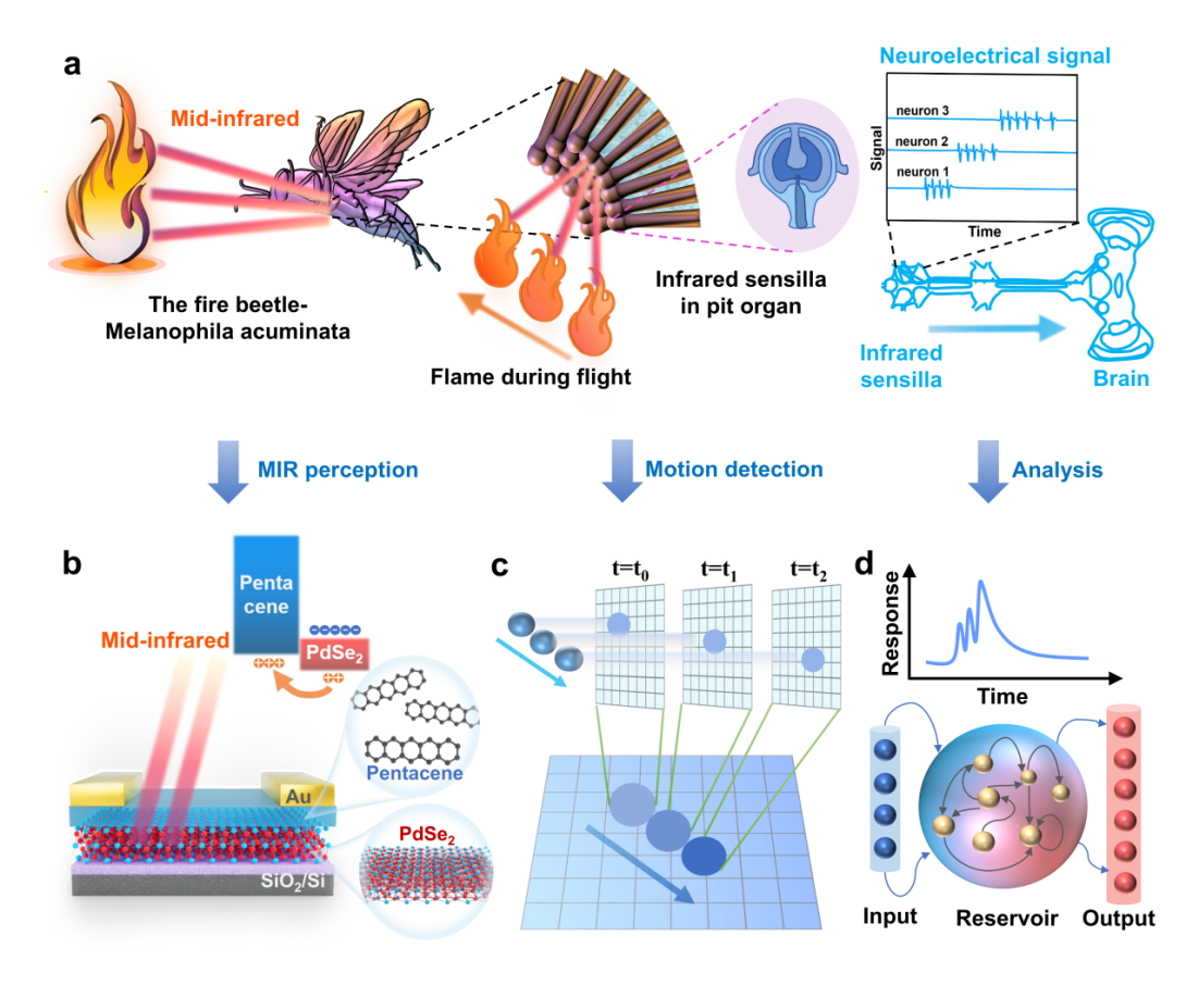 研究团队开发出了一种基于二维无机/有机(PdSe2/pentacene)异质结构的新型中红外神经形态晶体管。该晶体管基于持续光电导(PPC)效应,在4.25 μm中红外光照射下展现出类似生物突触的可塑性,并能通过调节光脉冲时长实现短期记忆到长期记忆的转换,展现出对动态运动轨迹的实时感知与记忆功能。基于此晶体管构建的储备池计算(RC)系统,在对中红外火焰运动数据集进行训练后,能够实现对火焰运动方向的精准识别,准确率高达94.79%。这一成果展示了其在高效、实时中红外机器视觉应用中的巨大潜力,为下一代中红外视觉系统的发展奠定了基础。