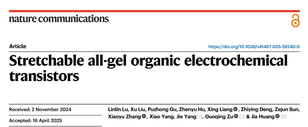 相关研究成果以“Stretchable all-gel organic electrochemical transistors”为题,在线发表于《自然·通讯》(Nature Communications)。论文第一作者为太阳集团tyc539博士生陆琳琳,通讯作者为黄佳教授、祖国庆副教授和杨洁研究员。