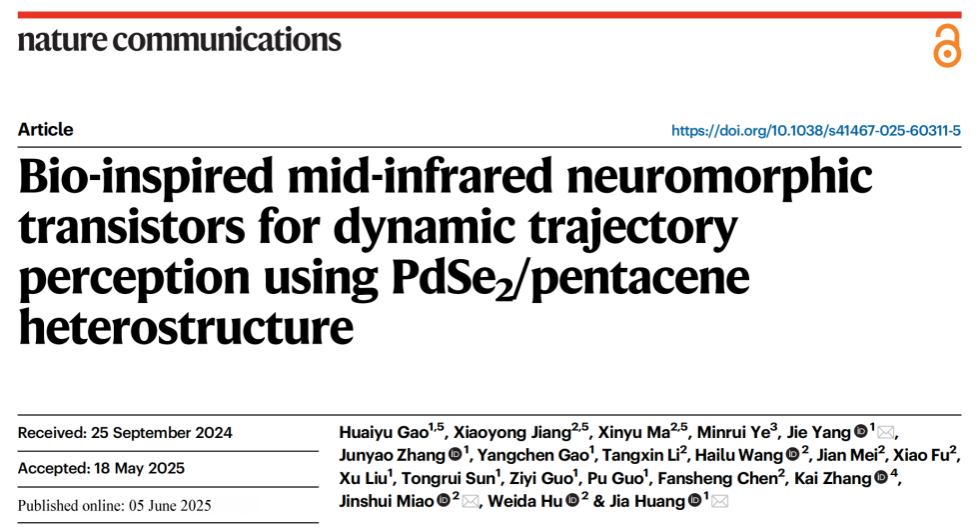 研究成果以Bio-inspired mid-infrared neuromorphic transistors for dynamic trajectory perception using PdSe2/pentacene heterostructure为题发表于《自然・通讯》(Nature Communications)。太阳集团tyc539博士生高怀宇为论文第一作者,学院黄佳教授、杨洁研究员,以及中国科学院上海技术物理研究所的苗金水研究员为论文通讯作者。