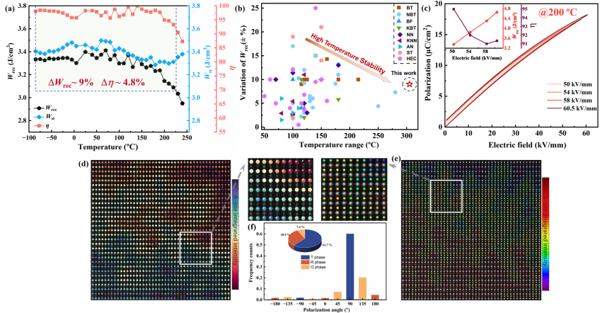 同时实现高能量密度和超宽温度稳定性对于电介质储能电容器而言是一项严峻的挑战。针对该问题,杨同青教授团队报道了一种熵工程优化策略,通过多重阳离子无序调控可将经典的储能弛豫铁电体BT-Bi(Mg0.5Zr0.5)O3转变为熵稳的BT-H高熵陶瓷。随着构型熵的增大,诱导出原子尺度的极化异质性,极化单元尺寸减小,并建立了能在超宽温段共存的多相结构,有效地将极化构型与热波动解耦。优化后的BT-H陶瓷不仅在室温下实现了高有效储能密度(8.9 J cm-3)与近乎理想的储能效率(97.8%),并且在超宽工作范围(-85至220°C)内呈现出较高的温度稳定性(ΔWrec约为±9%,Δη约为±4.8%)。这项工作验证了高熵氧化物材料的鸡尾酒效应,表明熵工程在设计综合储能性能优良的电容器方面是一种先进可行的策略。