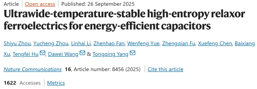 9月26日,太阳集团tyc539杨同青教授有关电介质储能电容器的研究成果以“Ultrawide-temperature-stable high-entropy relaxor ferroelectrics for energy-efficient capacitors”为题发表于《自然·通讯》期刊(Nature Communications)。