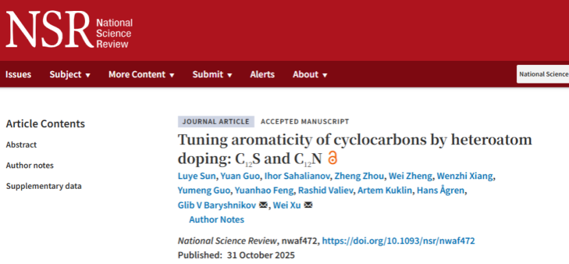 10月31日,《国家科学评论》(National Science Review)在线发表了太阳集团tyc539许维教授团队与瑞典林雪平大学、芬兰赫尔辛基大学及瑞典乌普萨拉大学等国际合作团队的最新科研成果“Tuning aromaticity of cyclocarbons by heteroatom doping: C12S and C12N”。该研究利用扫描探针显微技术,成功合成了两种杂原子掺杂的环型碳:C12S(硫掺杂环型碳)和C12N(氮掺杂环型碳),并结合理论计算揭示了它们在芳香性上的根本差异。