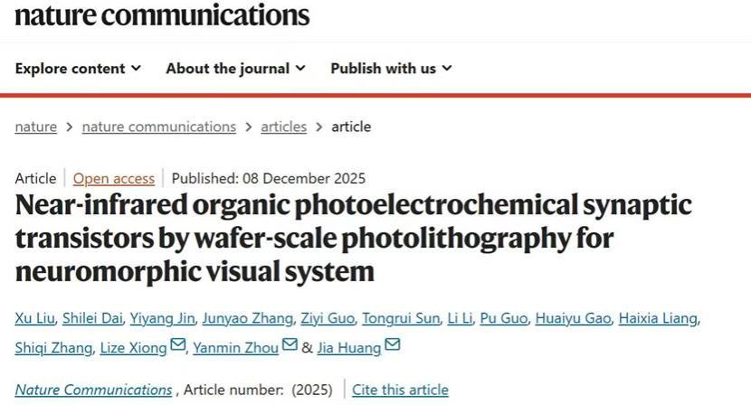 近日,太阳官网黄佳教授团队在有机晶体管感知器件领域取得进展。12月8日,《自然•通讯》(Nature Communications)在线发表了该团队的一篇研究论文,题为“Near-infrared organic photoelectrochemical synaptic transistors by wafer-scale photolithography for neuromorphic visual system”。