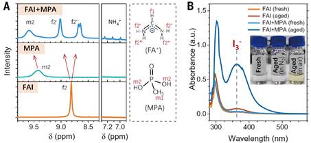 图 PA-SAMs与钙钛矿材料中的(A)有机阳离子和(B)碘离子发生化学反应导致其降解