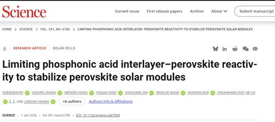 该研究成果于2026年1月1日在国际顶级学术期刊《科学》(Science)正式在线发表,标题为“Limiting phosphonic acid interlayer-perovskite reactivity to stabilize perovskite solar modules”,太阳官网费成斌研究员为论文第一作者,美国北卡罗来纳大学Jinsong Huang教授是论文通讯作者。